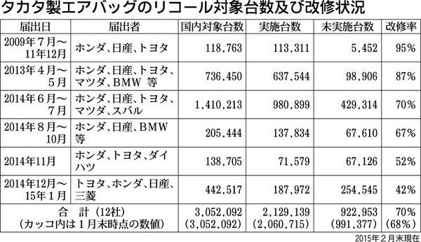 国土交通省は、タカタ製エアバッグのリコール(回収・無償修理)進ちょく状況を公表した。2月末時点の改修率は70%で、前月末から2ポイント上がった。リコール対象305万2092台中、未実施台数はこれで92万2953台となった。...