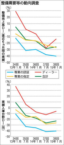 日本自動車整備振興会連合会(日整連、橋本一豊会長)は、「第38回整備需要等の動向調査」の集計結果をまとめた。2014年7~12月の「総整備売上高DI」(回答のうち「増えた」から「減った」を引いた割合)はマイナス25・9で、14年1~6月(...