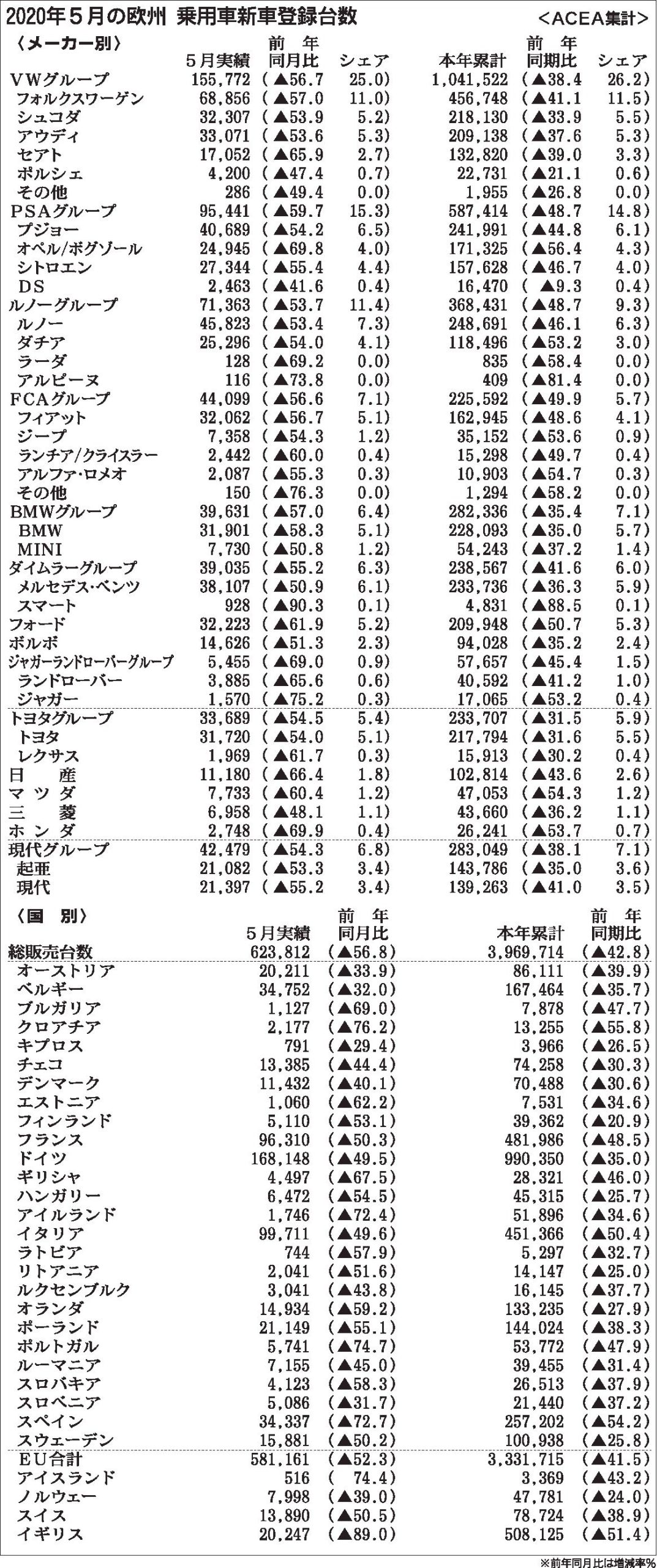 〈2020年5月の欧州乗用車新車登録台数(ACEA集計)〉