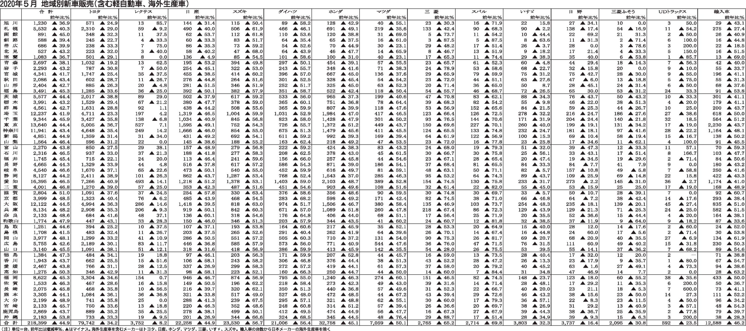 〈2020年5月 地域別新車販売(含む軽自動車、海外生産車)〉