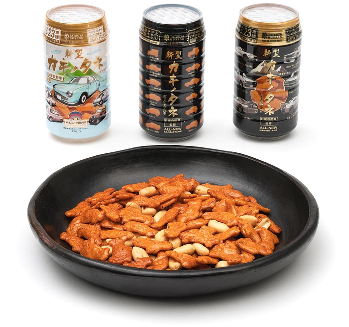 1933年生産の「ダットサン12型フェートン」から2019年発表の「アリアコンセプト」まで23車種と伊勢原市の「大山」のデザインを採用した。金型は一つの型で複数のデザインを同時に型抜きできる専用型を設計。辛さ控えめで、こおばしい醤油味の柿の種にまろやかでコクのある大粒バターピーナッツを合わせた。伊勢原市内の飲食店や中日本ハイウェイのサービスエリアなどで販売する。