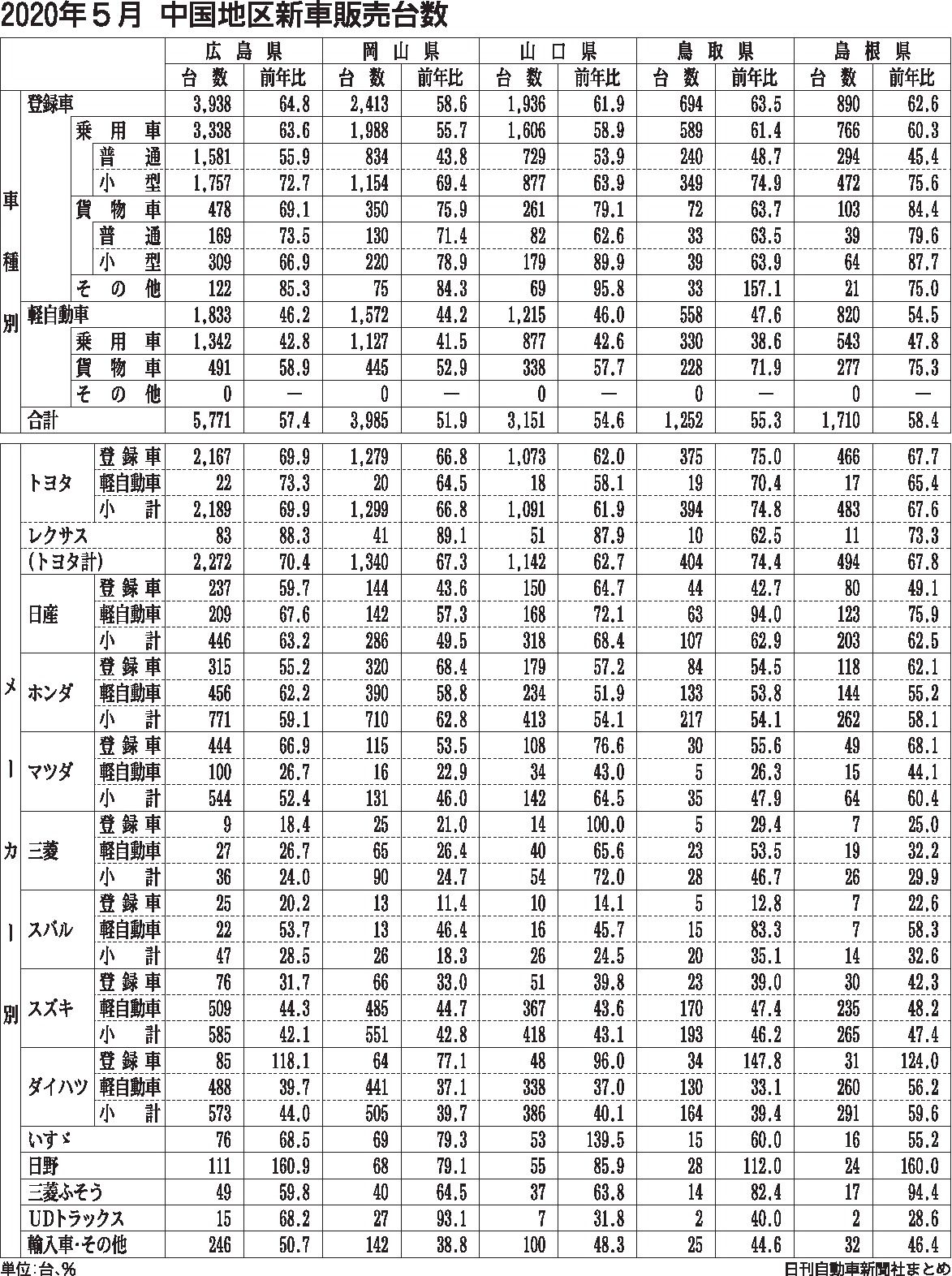 中国地区2020年5月の総新車販売台数は、前年同月比44・7%減の1万5869台となった。前月に比べ17・2㌽減。このうち登録車は同37・7%減の9871台で、前月比15・6㌽減。軽自動車は同53・3%減の5998台、同19・6㌽減となっ...