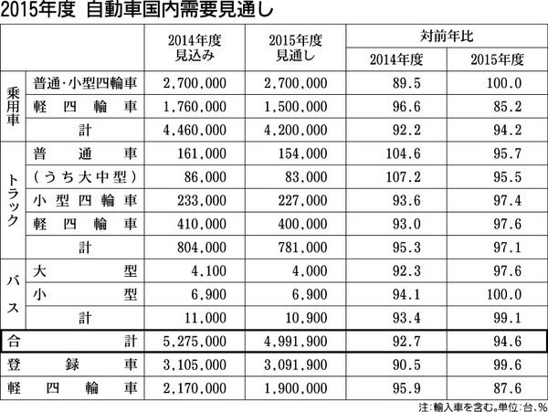 日本自動車工業会(自工会)は19日、2015年度(15年4月~16年3月)の国内四輪車需要見通しを14年度見込み比5・4%減の499万1900台と、4年ぶりの500万台割れに設定したと発表した。軽自動車税の増税による需要減少やエコカー減税...