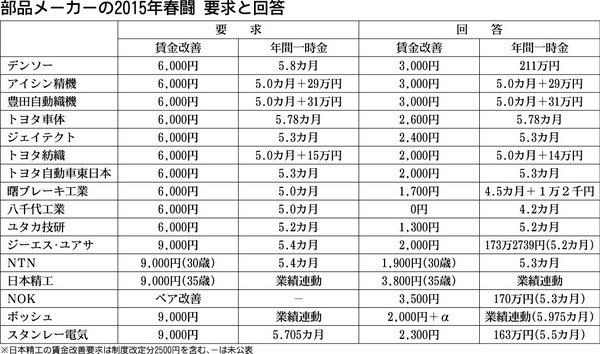 ■円安に苦しむ中小 波及どこまで 部品メーカーの2015年春闘は、自動車メーカーによる相場の引き上げにより、デンソーなどトヨタ系の大手が、昨年実績を上回る賃金改善(ベースアップ=ベアに相当)を回答した。独立系でも2年連続で賃金改善に応じる...