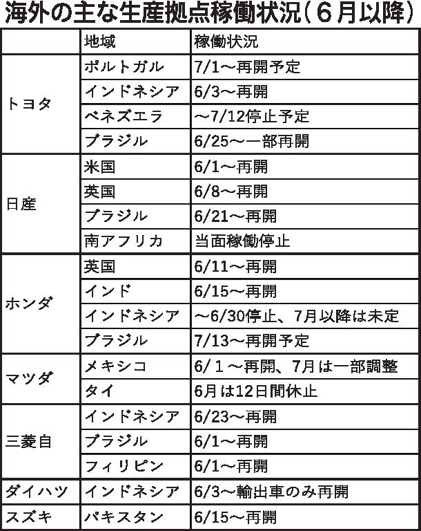 新型コロナウイルスの影響で操業を停止していた各乗用車メーカーの主な海外生産拠点のほとんどが7月までに稼働を再開する。各社が操業を止めていたインドネシアやブラジルなども6~7月にかけて再稼働。一方で、新型コロナ感染者数は世界全体で1千万人を...
