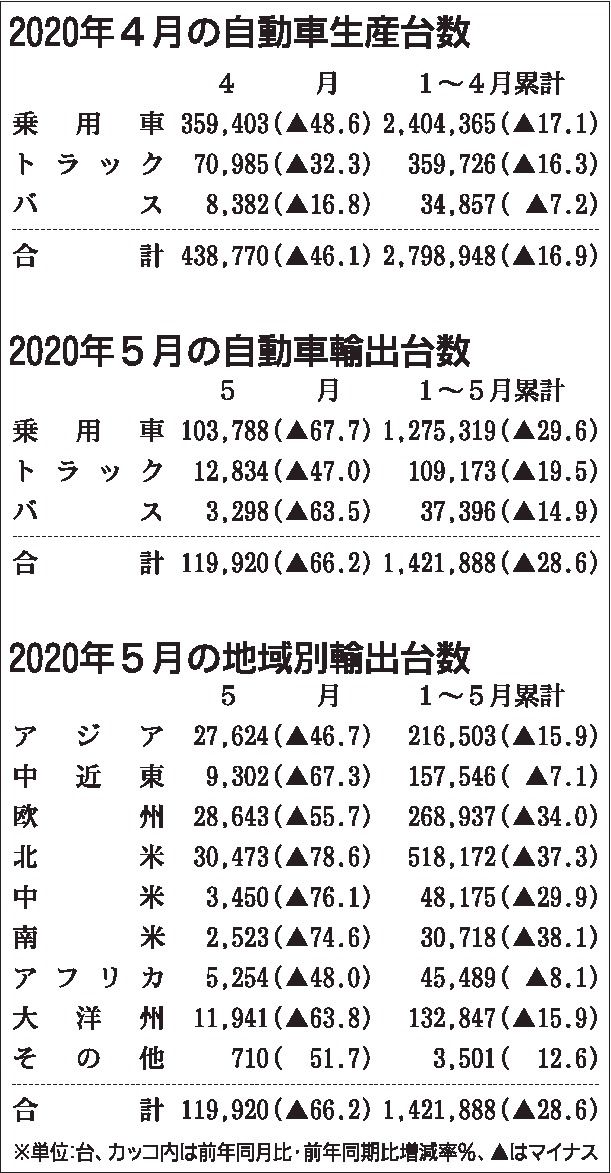日本自動車工業会(自工会、豊田章男会長)が30日にまとめた5月の輸出実績は前年同月比66.2%減の11万9920台だった。新型コロナウイルスによる海外の需要縮小や部品供給の乱れで大幅に減少した。4月と比べると欧州向けの減少率は若干改善したが、北米、アジア、中近東向けなどが一段と落ち込んだため、全体の減少率は54.2%減だった前月より広がった。