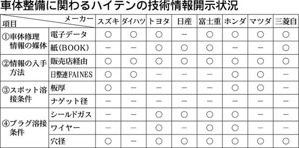 車体整備作業における高張力鋼板(ハイテン)の溶接条件の開示や情報の入手方法が自動車メーカーによって差があることがわかった。車体修理情報の展開媒体は電子データや紙で全社が開示しているものの、スポット溶接条件のナゲット径(接合界面の大きさ)は...