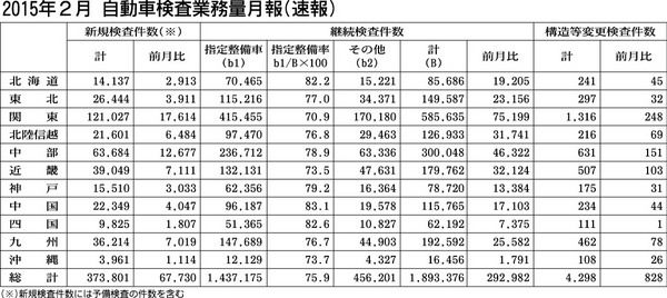 国土交通省は2月の自動車検査業務量(速報)をまとめた。それによると、新規検査件数は前年同月比4万7437件減(12・0%減)の37万3801件、継続検査件数は15万8176件増(8・0%増)の189万3376件。構造等変更検査件数は119...
