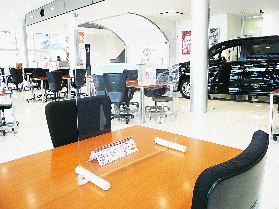 トヨタ南海グループ(久保尚平社長)は新型コロナウイルス感染症対策の一環としてアクリル板を用いたシールドボードをグループの全営業スタッフを中心に約610人に配布した。来店客との商談時などに卓上で用いて、顧客と従業員の安全確保に役立てている=...