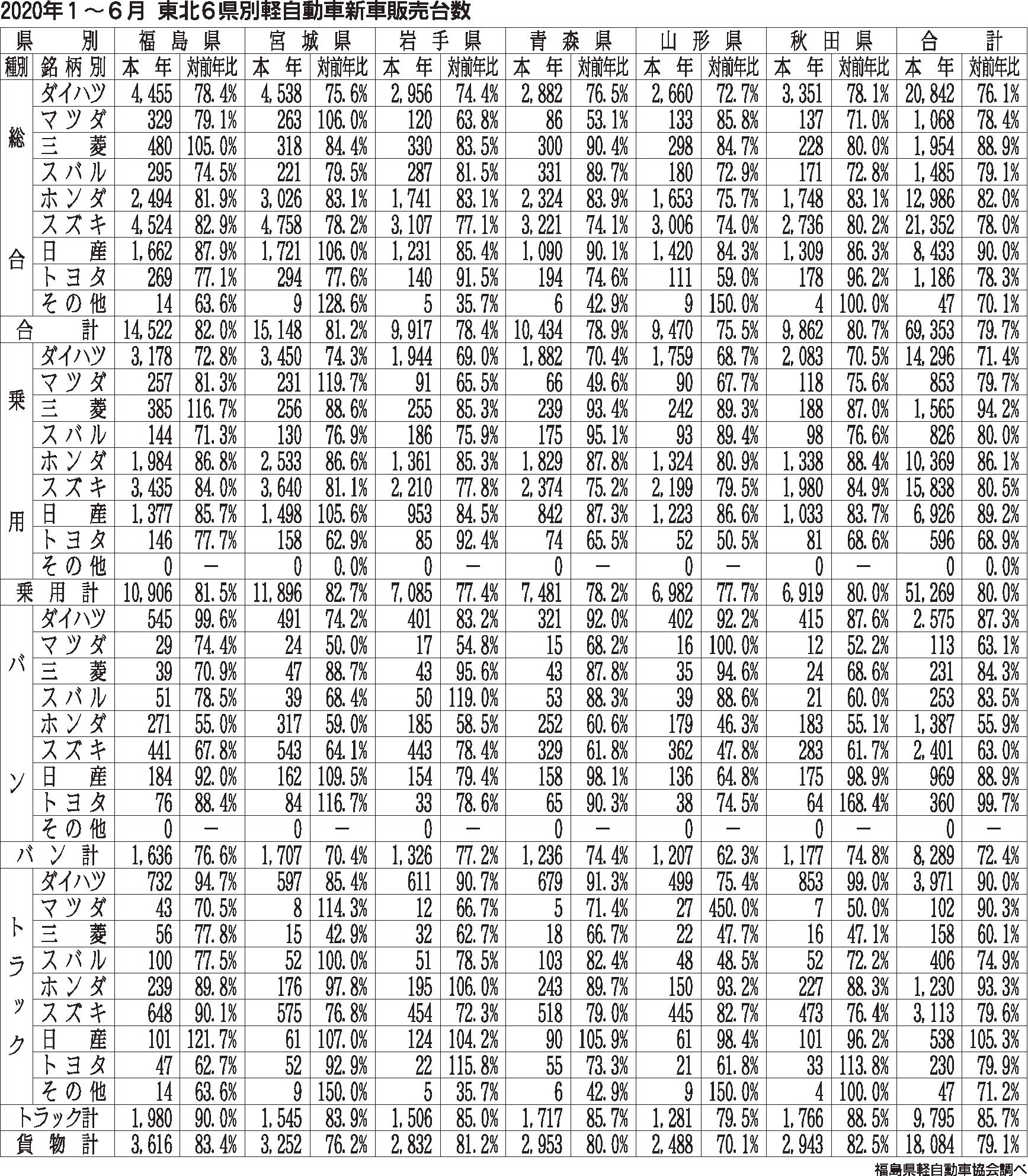 〈2020年1~6月 東北6県別軽自動車新車販売台数〉