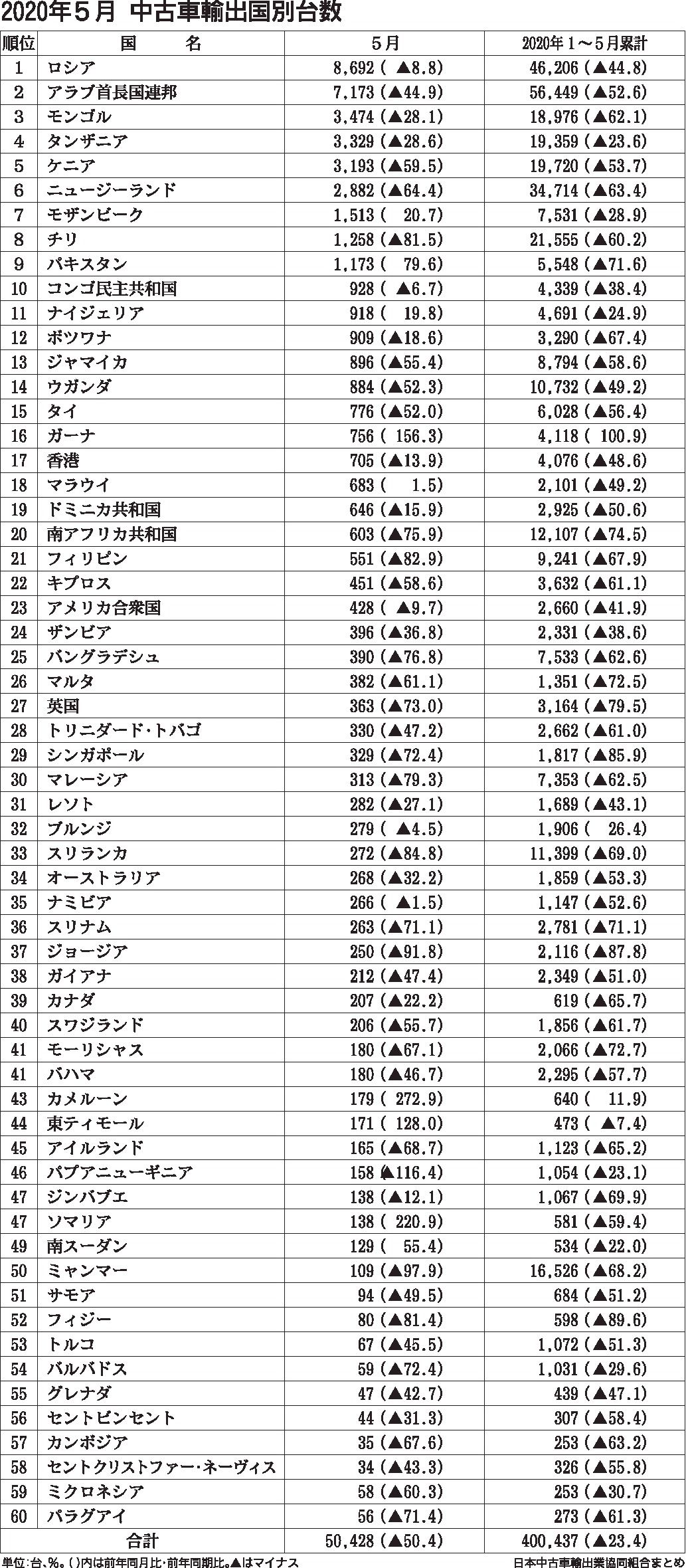 日本中古車輸出業協同組合(佐藤博理事長)がまとめた2020年5月の中古車輸出台数は、前年同月比50・4%減の5万428台となり3カ月連続で前年を下回った。台数が5割以上減少したのは2カ月連続。1~5月累計は前年同期比23・4%減の40万4...