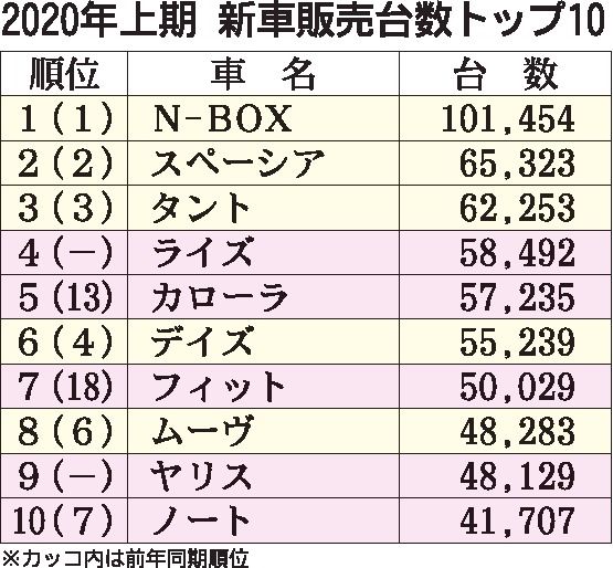 2020年上期(1~6月)の登録車と軽自動車を合わせた車名別新車販売台数は、ホンダ「N-BOX(エヌボックス)」が4年連続でトップだった。コロナ禍で4~6月の新車販売台数が前年を大きく下回ったものの、2位のスズキ「スペーシア」に約3万6千台の差をつけて独走した。続くダイハツ工業「タント」を含めトップ3を軽が占める中、総合4位につけたトヨタ自動車「ライズ」がSUVとして初めて登録車ランキングで上期トップの座を獲得。「カローラ」とともにトヨタ車の販売をけん引した。