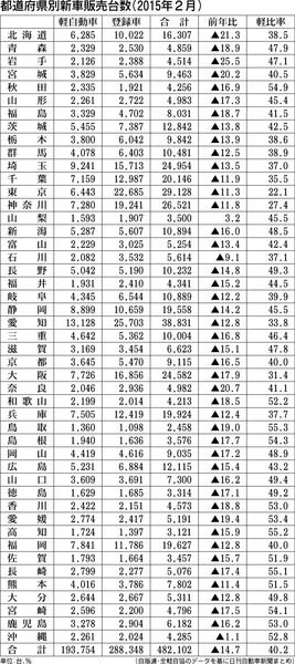 日刊自動車新聞は2015年2月の都道府県別新車販売台数および軽自動車比率をまとめた。販売台数は山梨を除く46都道府県で減少。軽比率が最も高かったのは鳥取で55・3%だった。2月の全国市場は前年同月比14・7%減。47都道府県のうち、最も減...