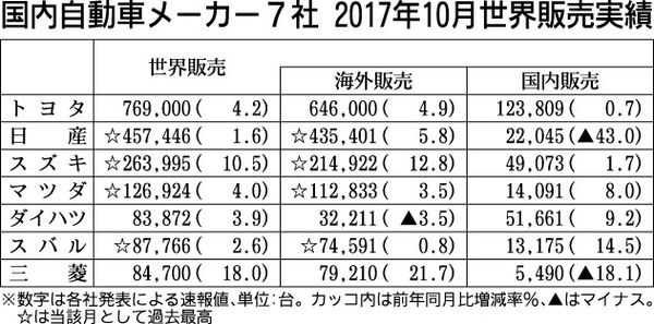 ホンダを除く乗用車メーカー7社は29日、2017年10月の世界販売実績を発表した。2カ月ぶりに7社すべてが前年を上回り、中でも日産自動車、スズキ、マツダ、スバルの4社が10月として過去最高となった。日産は好調な海外販売が、完成車検査問題の...