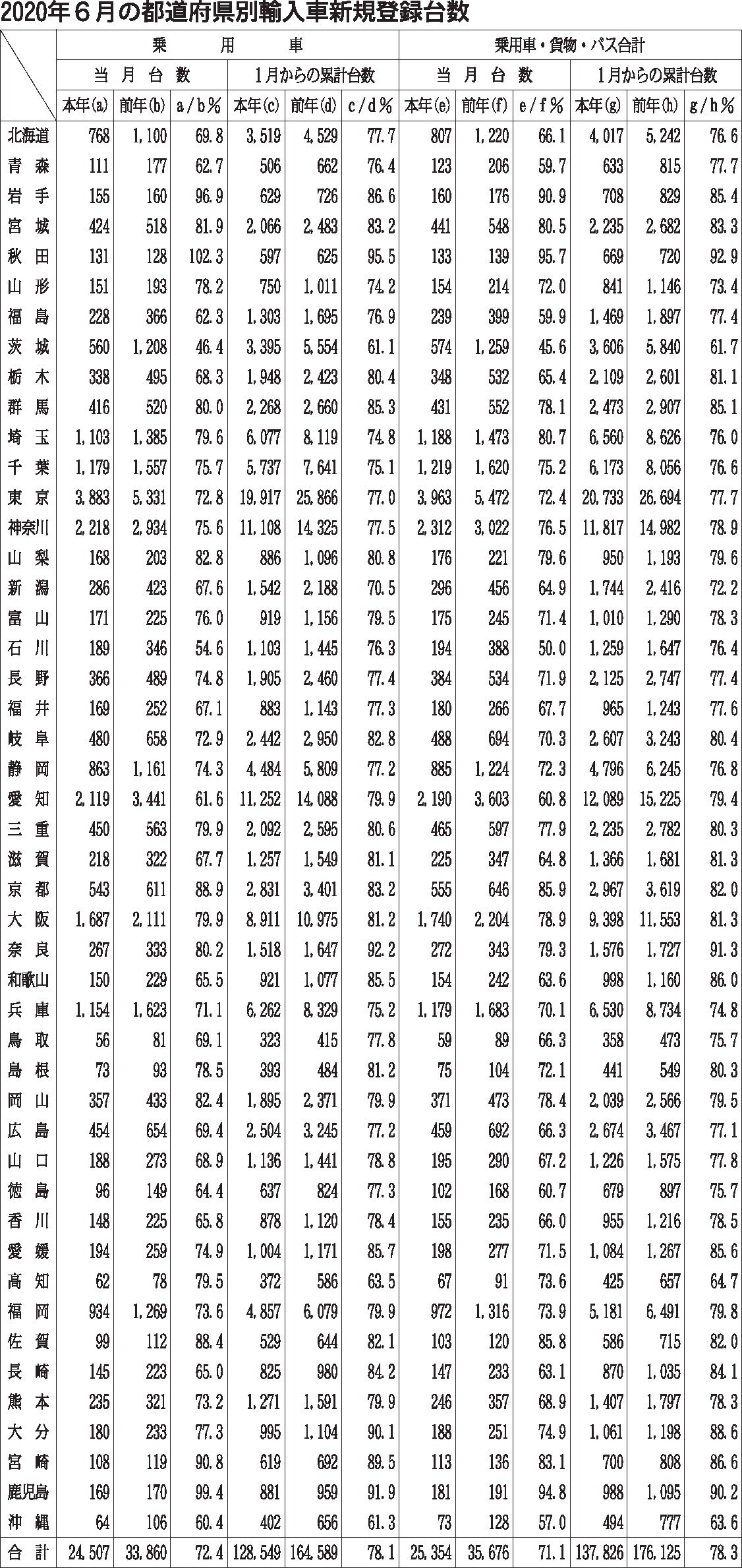 〈2020年6月の都道府県別輸入車新規登録台数〉