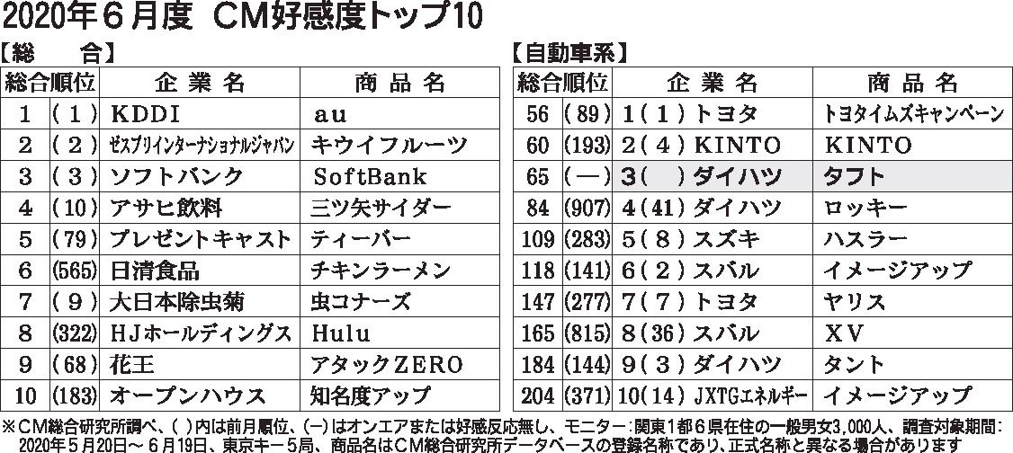 CM総合研究所(関根心太郎代表、東京都港区)は、2020年6月度のCM好感度ランキングを公表した。総合ランキングではauスマートフォンの料金プランを訴求するKDDI「三太郎シリーズ」が6カ月連続の首位、ゼスプリインターナショナルジャパン「キウイフルーツ」が先月に続き2位だった。自動車業類はトップ10を逃した。
