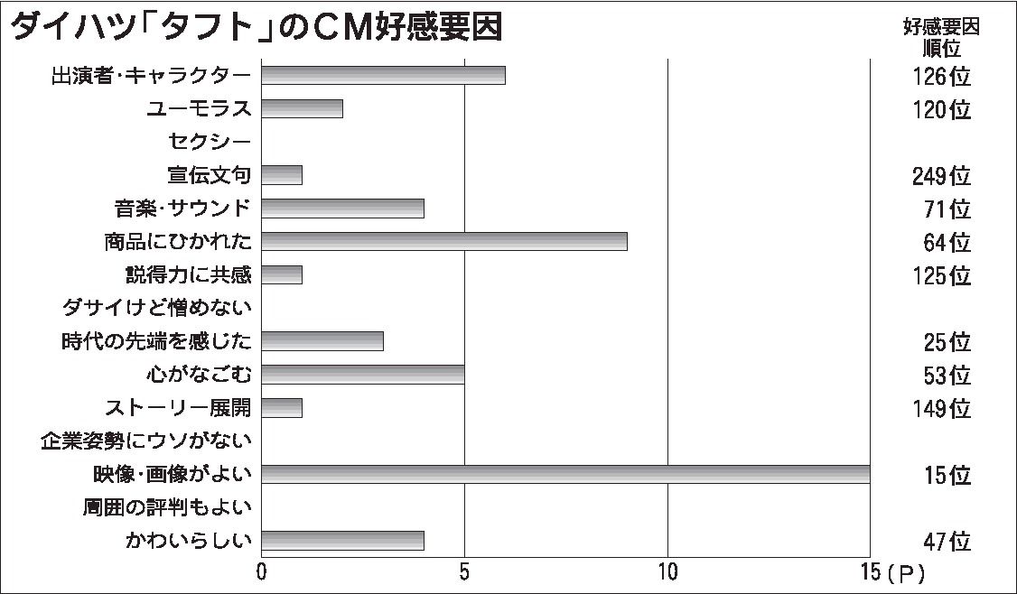 自動車業類の好感度ランキングでは、トヨタ自動車が「トヨタイムズキャンペーン」と「KINTO」で1、2位を占めた。3位は初登場となったダイハツ工業の新型SUV「タフト」で、CM総研は同モデルに注目した。