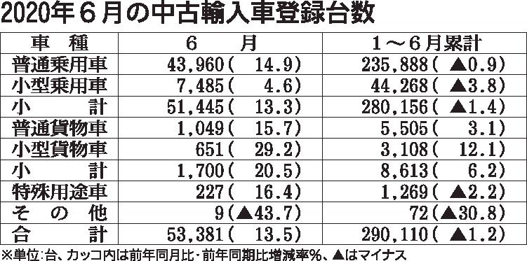 日本自動車輸入組合(JAIA、ティル・シェア理事長)が10日に発表した2020年上期(1~6月)の中古輸入車登録台数は、前年同期比1.2%減の29万110台となり6年ぶりにマイナスに転じた。車種別では、乗用車が同1.4%減の28万156台、貨物車が同6.2%増の8613台となった。