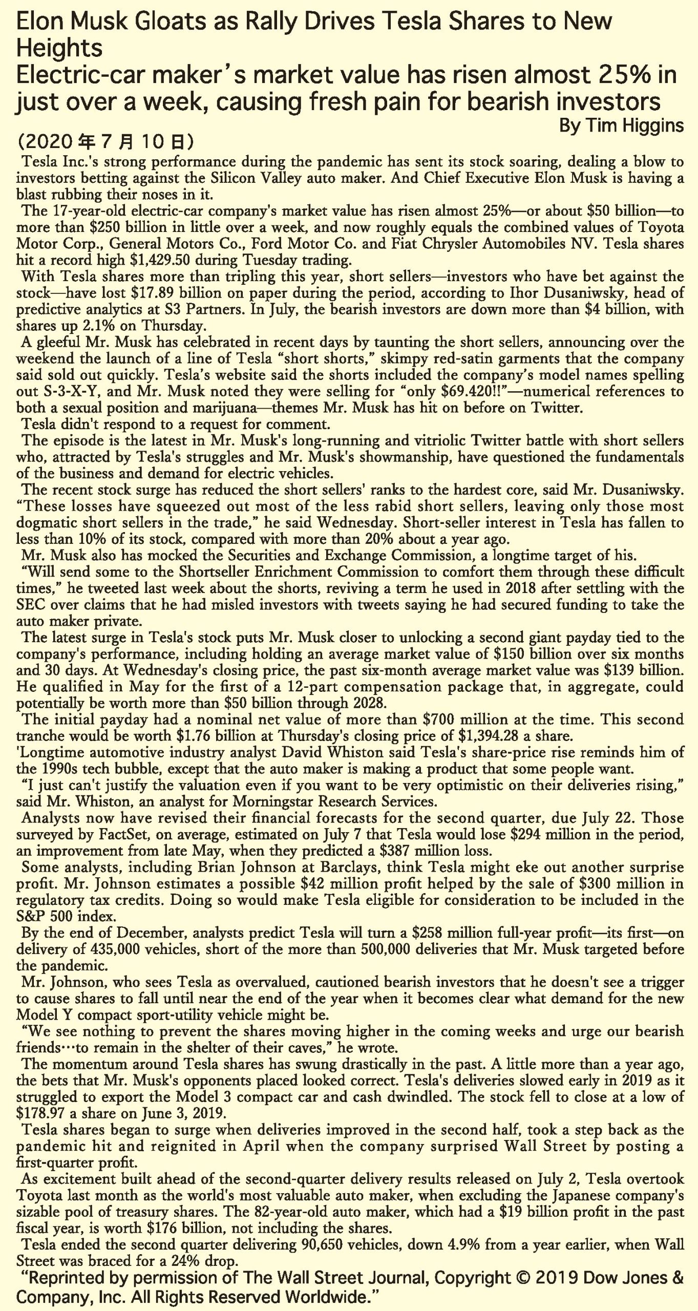 By Tim Higgins2020 年 7 月 10 日 電気自動車(EV)メーカーの米テスラは新型コロナウイルス感染症が世界的に流行する中でも力強いパフォーマンスを見せ、株価が急騰している。同社株のショートセラー(空売り筋)にとっては...