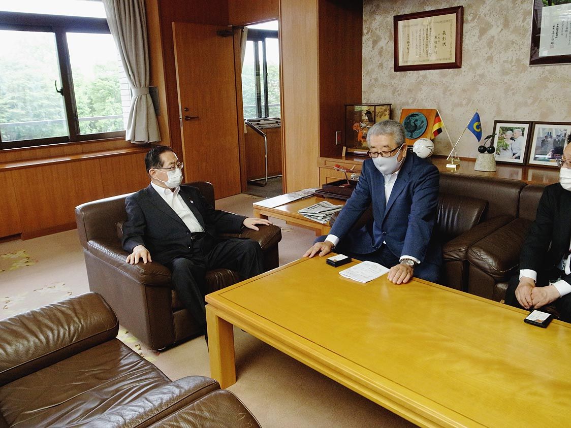 【山形】山形日産(小関眞一社長)を中核会社とする山形日産グループの小関社長は、東根市の土田正剛市長を表敬訪問した=写真。県内の自治体で初めて環境マネジメントに関する国際規格「ISO14001」の認証を受けた同市は、二酸化炭素(CO2)排出...