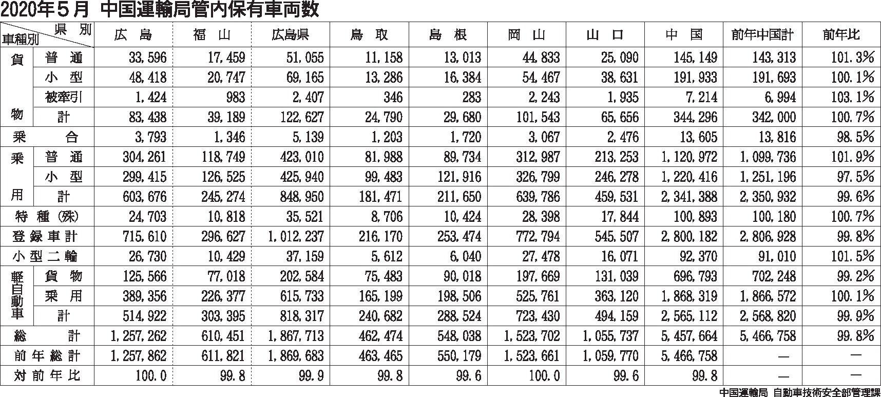 〈2020年5月 中国運輸局管内保有車両数〉