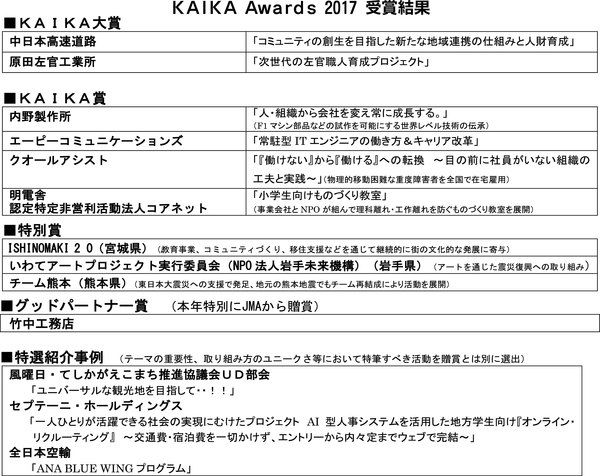 日本能率協会(中村正己会長、JMA)は「KAIKA Awards(カイカアワード)2017」受賞結果およびエントリー傾向から見た「KAIKA経営トレンド」を発表した。17年度のKAIKA大賞は中日本高速道路の「コミュニティーの創生を目指し...
