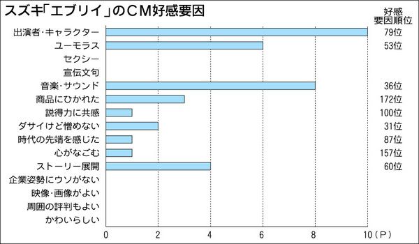 CM総合研究所(関根心太郎代表、東京都港区)がまとめた3月度のCM好感度ランキング。総合の上位はKDDIの「au」が首位、ソフトバンクモバイルの「ソフトバンク」が2位で変わらず。3位にはトライグループの「家庭教師のトライ」、4位にはワイモ...