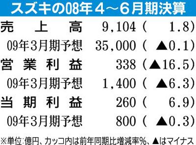 スズキが31日発表した2008年4~6月期連結業績は円高や原材料価格高騰などのマイナス影響を売り上げ増や原価低減などでカバーしきれず、四半期決算を開示した04年度以降初の営業減益となった。北米事業はSUVの販売不振などで32億円の営業赤字...