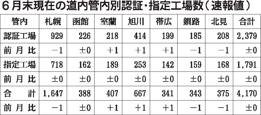 北海道運輸局は、6月末現在の道内分解整備工場数をまとめた。それによると前月末と同数の4170工場だった。うち認証工場2379工場、指定工場1791工場。管内別で認証工場は多少増減がああり、指定工場では変動がなかった。...