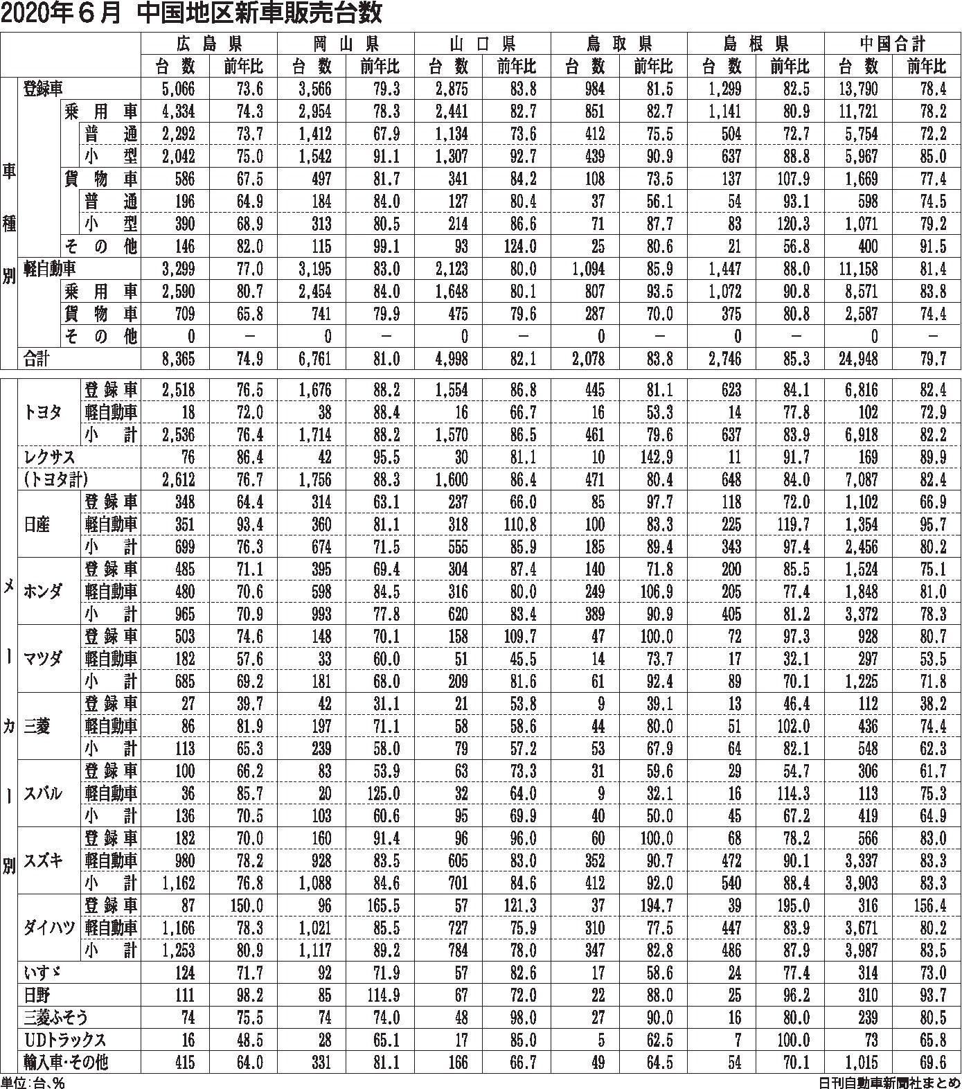 中国地区2020年6月の総新車販売台数は、前年同月比20・3%減の2万4948台となった。前月に比べ24・4㌽増に転じた。このうち登録車は同21・6%減の1万3790台で、前月比16・1㌽増。軽自動車は同18・6%減の1万1158台、同3...