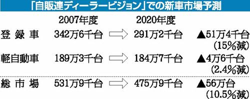 日本自動車販売協会連合会(自販連)は1日、2020年度の登録車、軽自動車を合計した国内乗用車の新車需要台数が06年度に比べて14%減の約400万台に縮小するとの長期需要予測を公表した。同日発表した08年版の「ディーラービジョン」にまとめた...