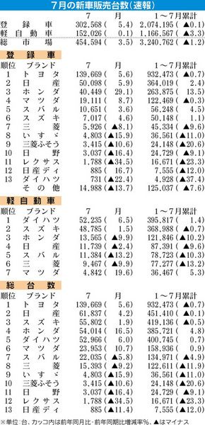 日本自動車販売協会連合会(自販連、天野洋一会長)と全国軽自動車協会連合会(全軽自協、村田浩平会長)が1日発表した7月の新車販売は、前年同月比3・6%増の45万4594台と3カ月ぶりのプラスとなった。登録車は同5.4%増の30万2568台と...