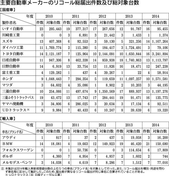 国土交通省が10日公表した2014年度のリコール(回収・無償修理)届出件数は335件(前年度比17・2%増)、対象台数は955万7888台(同19・8%増)だった。タカタ製エアバッグに関連するリコール台数が全体の2割(219万6879台)...