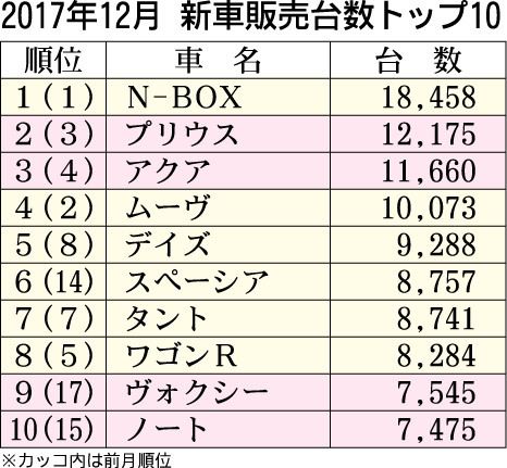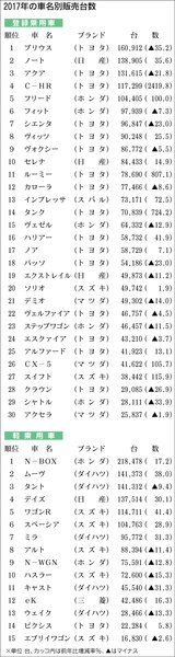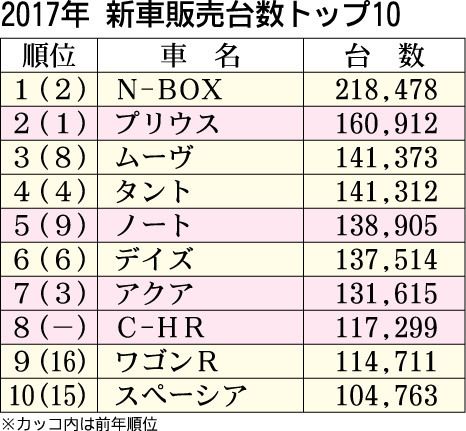 2017年の車名別新車販売(軽自動車含む)は、ホンダ「N―BOX(エヌボックス)」が初めて総合1位を獲得した。ホンダが総合1位を取るのは「フィット」以来15年ぶりで、軽では初。2位には前年1位のトヨタ「プリウス」、3位には前年8位のダイハ...