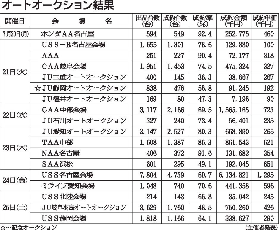 〈オートオークション結果〉中部地区 2020/7/20~25
