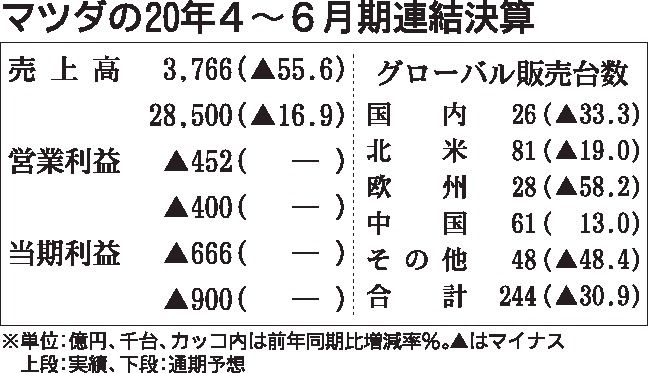 マツダは31日、2021年3月期の営業損益が400億円の赤字になりそうだと発表した。新型コロナウイルスによる世界経済の停滞で今年度の販売台数は前年比8%減の130万台に減少する見通し。コスト改善と固定費の削減を徹底し、22年3月期での反転につなげる。