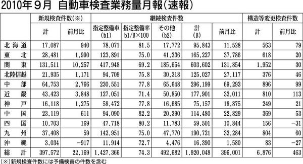 国土交通省は、2010年9月の自動車検査業務量(速報)をまとめた。全国の新規検査件数は前月比2万2169件増の39万7572件、継続検査件数は同39万6001件増の192万48件となった。指定整備率は同0・7ポイント増の74・3%。構造等...