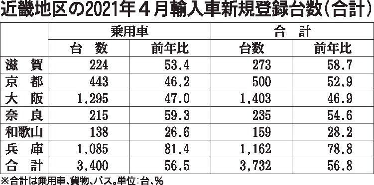 日本自動車輸入組合(JAIA)の発表によると、4月の近畿地区の輸入車新規登録台数(外国メーカー車と日本メーカー車)は、前年同月比56・8%増の3732台だった。前の年を上回るのは7カ月連続。乗用車が56・5%増の3400台、貨物車は59・...