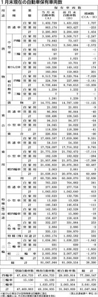 自動車検査登録情報協会(自検協、後藤悦治郎理事長)が発表した1月末の自動車保有台数(軽自動車含む)は、前月比0・05%増の8104万7944台で、3カ月連続のプラスとなった。 車種別は、登録車が0・02%減の4746万9863台、軽自動車...