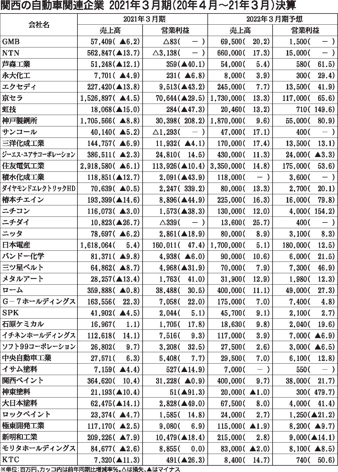 関西に本社を置く自動車関連上場企業の2021年3月期決算が出そろった。日刊自動車新聞社関西支社がまとめた38社のうち8割超となる31社が減収となった。新型コロナウイルスの感染拡大の影響をもろに受けた第1四半期の急激な売り上げ低迷分を、巻き...