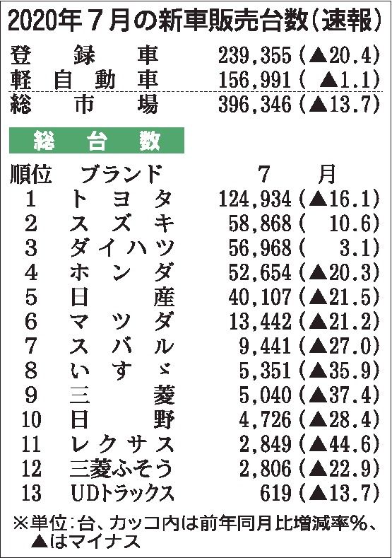 7月の新車販売台数は、前年同月比13・7%減の39万6346台となり、減少幅が6月より9・2㌽改善した。特に3銘柄がプラスに転じた軽自動車は、スーパーハイトワゴンやSUVなど受注残を抱えていた人気車の届け出が進み、同1・1%減と回復した。...