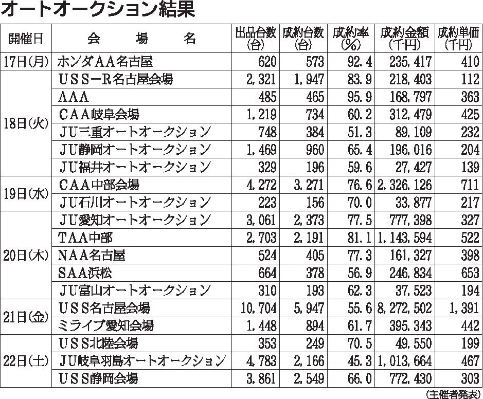 〈オートオークション結果〉中部地区 2021/5/17~22