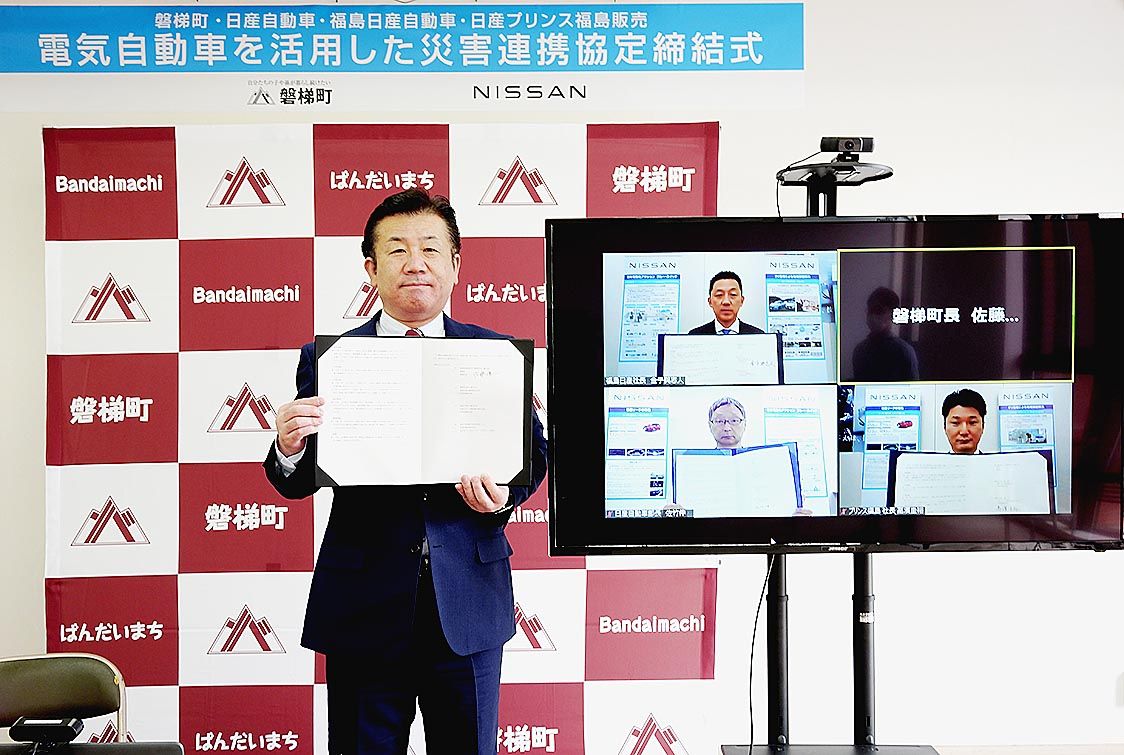 【福島】福島県磐梯町(佐藤淳一町長)と日産自動車、福島日産(金子與志人社長)、日産プリンス福島(高濱圭裕社長)の4者は、電気自動車(EV)を活用した「災害連携協定」を締結した=写真。災害などで停電が発生した際に、日産のEV「リーフ」を電力...