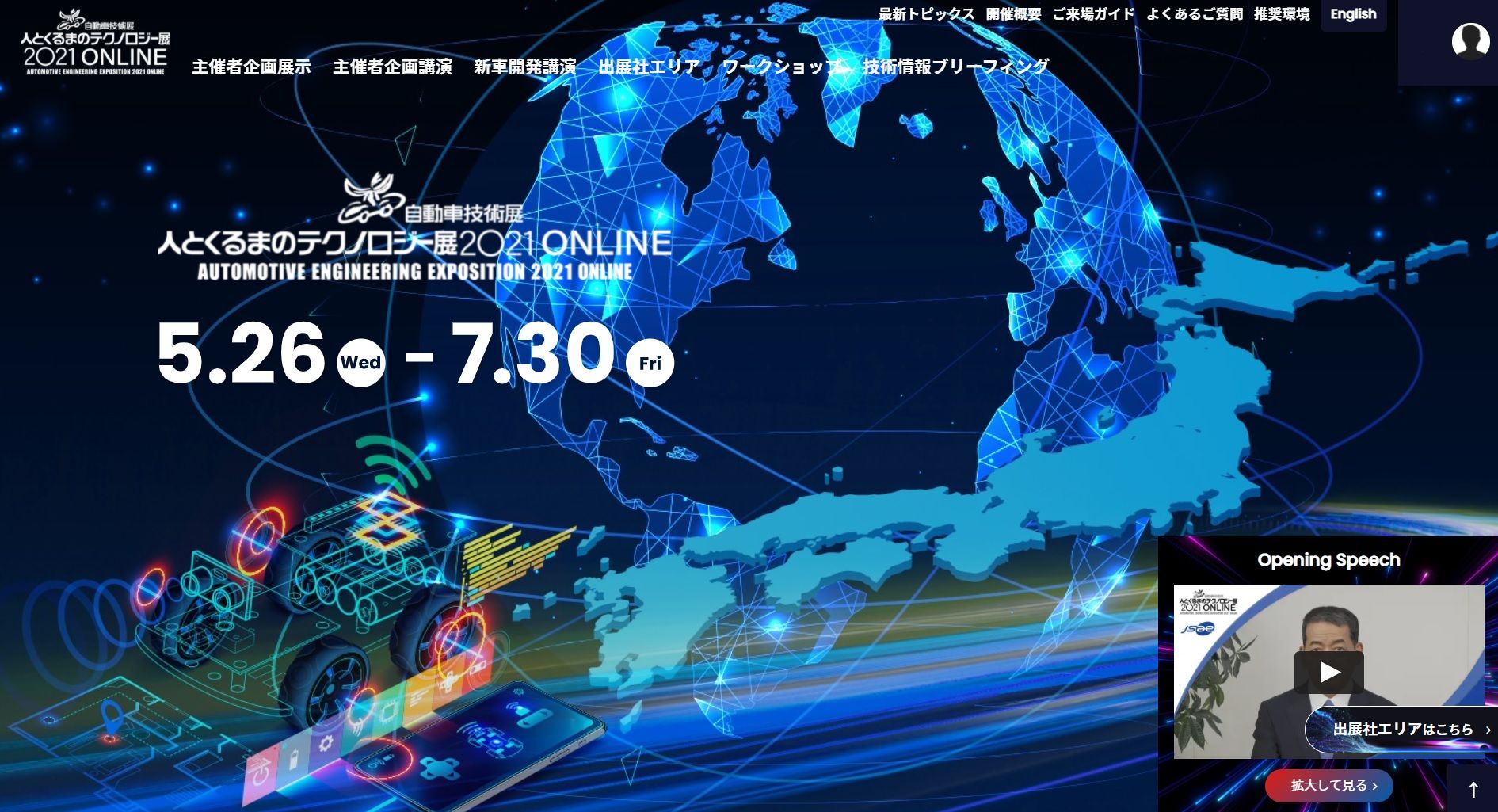 自動車技術会(自技会、寺師茂樹会長)は、自動車技術のオンライン展示会「人とくるまのテクノロジー展2021オンライン」を26日に開幕した。新型コロナウイルス感染防止の観点から横浜会場での実地開催は2年連続中止となったものの、オンライン開催とした今回は447社が出展。自動車業界が直面するCASE(コネクテッド、自動運転、シェアリング、電動化)対応やカーボンニュートラルの実現に寄与するさまざまな最新技術やソリューションが提案されている。