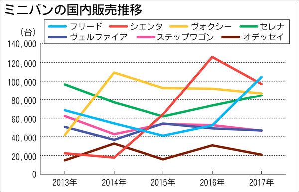 ミニバンのカテゴリーで2017年の販売台数が最も多かったのは、10万4千台を販売したホンダ「フリード」だった。16年9月に8年ぶりに全面改良し、17年は新車効果がフルに効いて前年比2倍を記録した。 ミニバンの中でも、フリードが属する小型ミ...