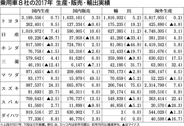 乗用車メーカー8社、17年実績 世界生産 7社が過去最高