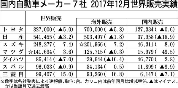 ホンダを除く乗用車7社は30日、2017年(1~12月)の世界販売実績を発表した。トヨタ自動車、日産自動車、スズキ、マツダ、スバルの5社が暦年としての過去最高記録を更新した。各社ともに海外販売も過去最高で、国内販売においても堅調だった。 ...