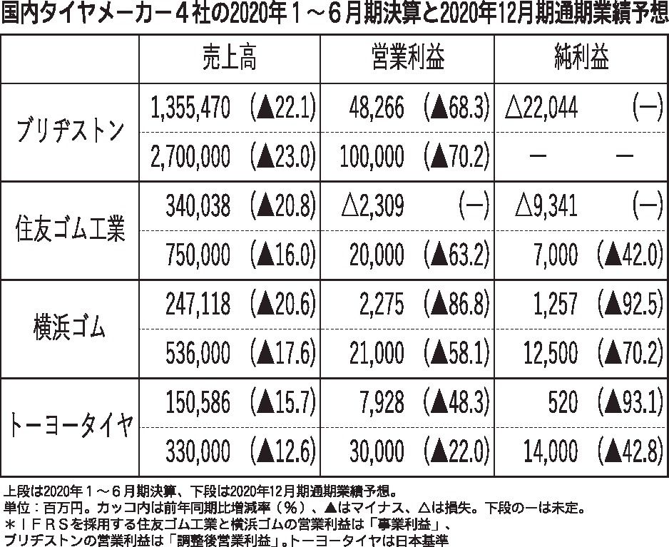 国内タイヤメーカー4社の2020年1~6月期の決算は、全社が新型コロナウイルスの影響で減収減益となった。ロックダウン(都市封鎖)や新車需要の縮小を受けた生産調整を世界規模で行ったことで、新車装着用タイヤを中心に減産したことが響いた。各社と...