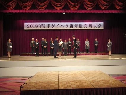 【花巻】岩手ダイハツ(中田利光社長)は20日、花巻市内で「2018年新年販売店大会」を開催した。県内の有力販売店の代表者など65社115人が出席し、車両販売と部用品販売で実績を残した販売店へ、中田社長が表彰状を手渡した。 中田社長は「昨年...