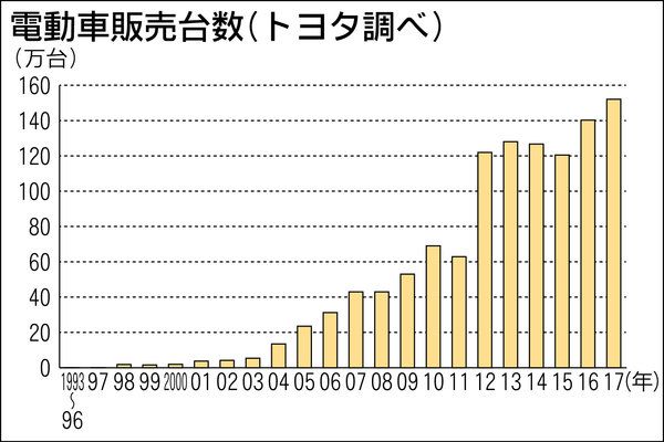 トヨタ自動車は2日、2017年の同社の電動車世界販売が152万台となり、環境長期計画で掲げた「20年までに150万台」の目標を3年前倒しで達成したと発表した。昨年12月に公表した「30年に550万台以上」に向けて「電動車を着実に普及させる...